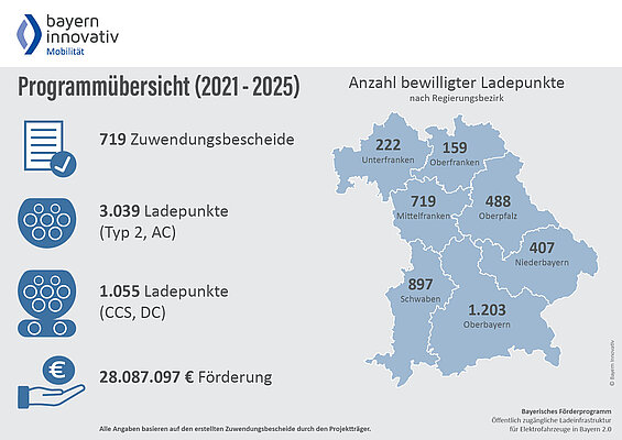 Aufgrund einer zunehmenden Diskrepanz zwischen E-Fahrzeugbestand und Ladeinfrastruktur besteht weiterhin ein hoher Bedarf an Förderung für öffentlich zugängliche Ladeinfrastruktur. Als Reaktion hierauf verfolgt der Freistaat in Form des Förderprogramms „Öffentlich zugängliche Ladeinfrastruktur für Elektrofahrzeuge in Bayern 2.0“ die Beschleunigung des Ausbaus und die Verdichtung der Ladeinfrastruktur in Bayern.