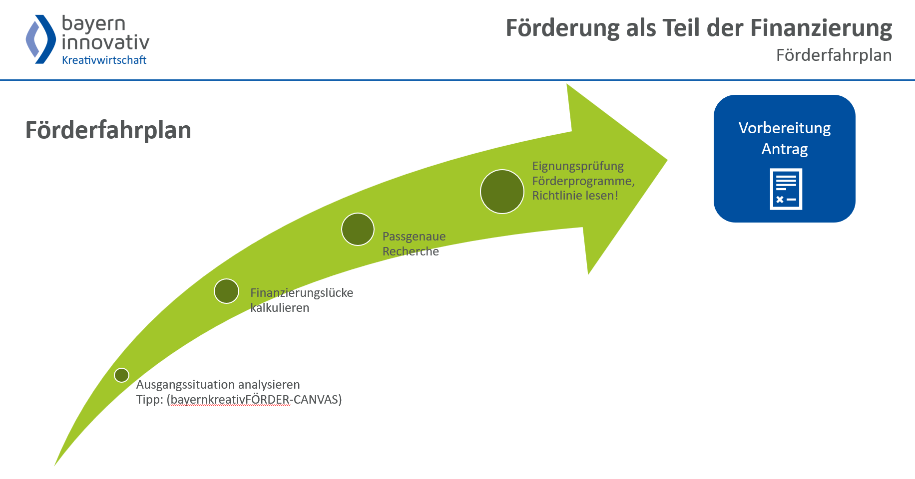 Es lohnt sich Zeit in die Vorbereitung deines Vorhabens zu investieren, bevor du einen Förderantrag stellst. Somit wird das Einreichen von Förderanträgen vermieden, die formal oder inhaltlich nicht zum eigenen Vorhaben bzw. zu den geforderten Voraussetzungen passen und deshalb abgelehnt werden. Diese Zeit kannst du besser nutzen. Deshalb hat bayernkreativ einen „Förderfahrplan“ entwickelt: Eine strukturierte Vorgehensweise, von der Idee bis zur Antragstellung.