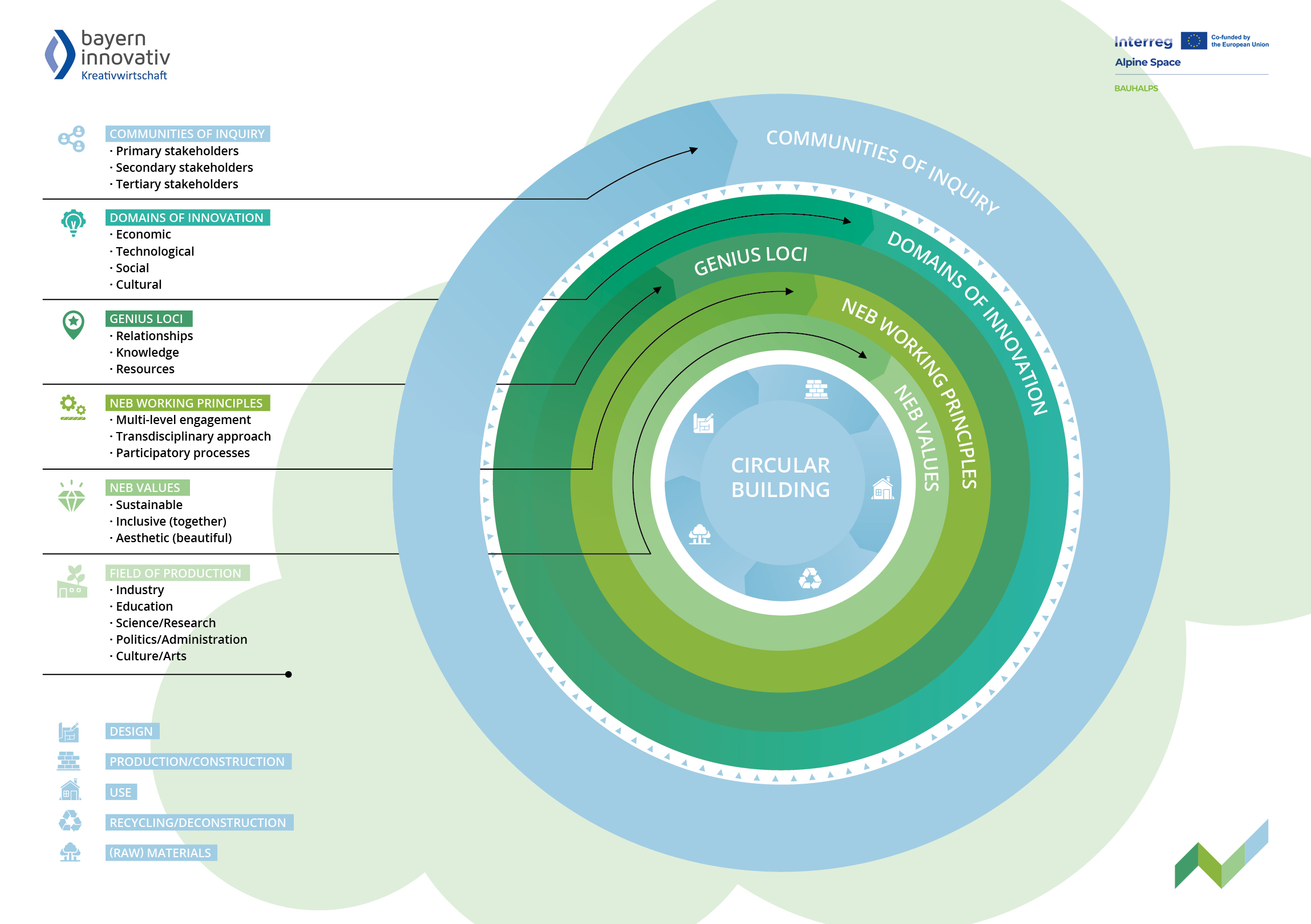 Das BAUHALPS-Modell nimmt Bezug auf die Neue Europäische Bauhaus (NEB) Initiative und beschreibt einen ganzheitlichen Ansatz zur Förderung regenerativer Systeme im Kontext des alpinen Bauens. Durch die Aktivierung von lokalem Wissen, Ressourcen und Gemeinschaften fördert das Modell die Zusammenarbeit über Disziplinen und Sektoren hinweg und stellt sicher, dass die NEB Werte Nachhaltigkeit, Schönheit und Inklusion zu greifbaren Treibern des Wandels werden. Letztlich definiert BAUHALPS die zirkuläre Architektur neu – als kulturelles Projekt, das in Ort, Identität und kollektiver Verantwortung verwurzelt ist und neue Technologien nutzbar macht.