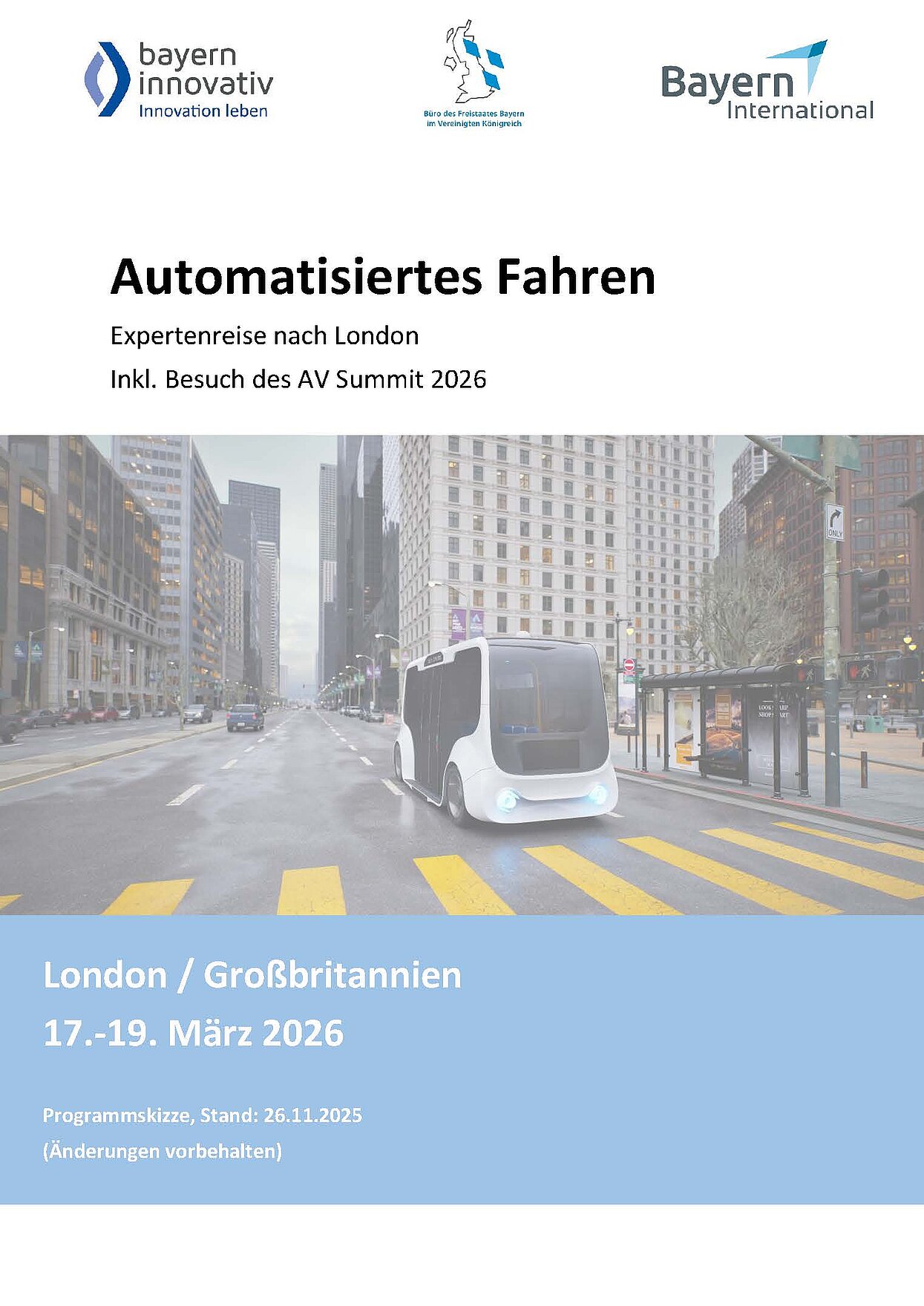 Gemeinsam mit dem Büro des Freistaats in London planen wir eine Expertenreise zum Thema „Autonomes Fahren“ nach London, einschließlich des gemeinsamen Besuchs des AV Summits. Die Reise umfasst ein Networking-Event mit britischen Stakeholdern, z.B. CCAV, Transport for London, Zensic sowie Besuchstermine bei einschlägigen Unternehmen (z.B. Oxa).