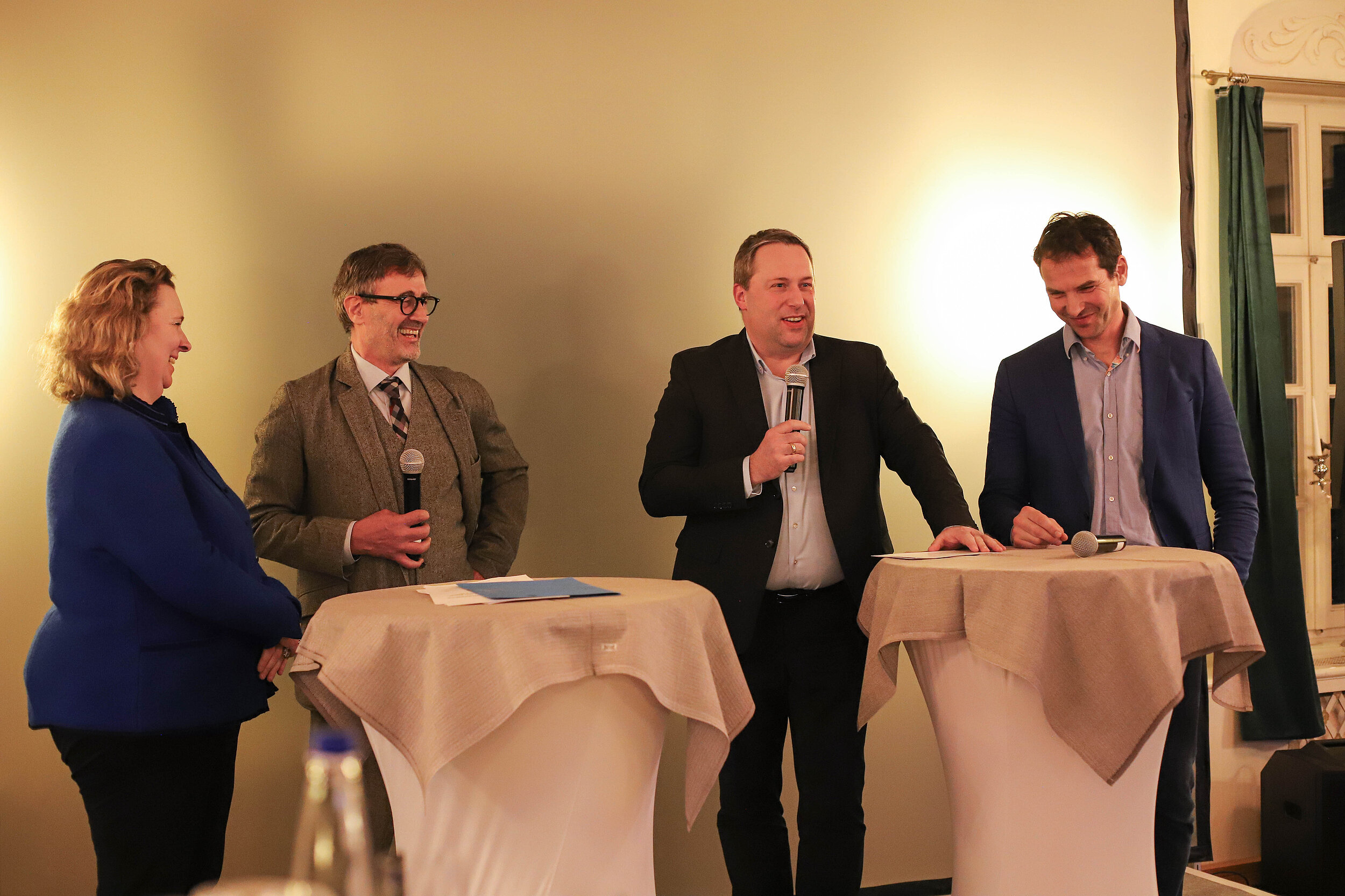 Discussion round at the New Year's reception of the VBEW initiative "Hydropower - Yes please!" with Kerstin Schreyer, Member of Parliament, Georg Loy (Verbund Innkraftwerke), Marian Rappl (VBEW), Martin Stümpfig, Member of Parliament (from left); photo credits: VBEW/Marina Kuhn