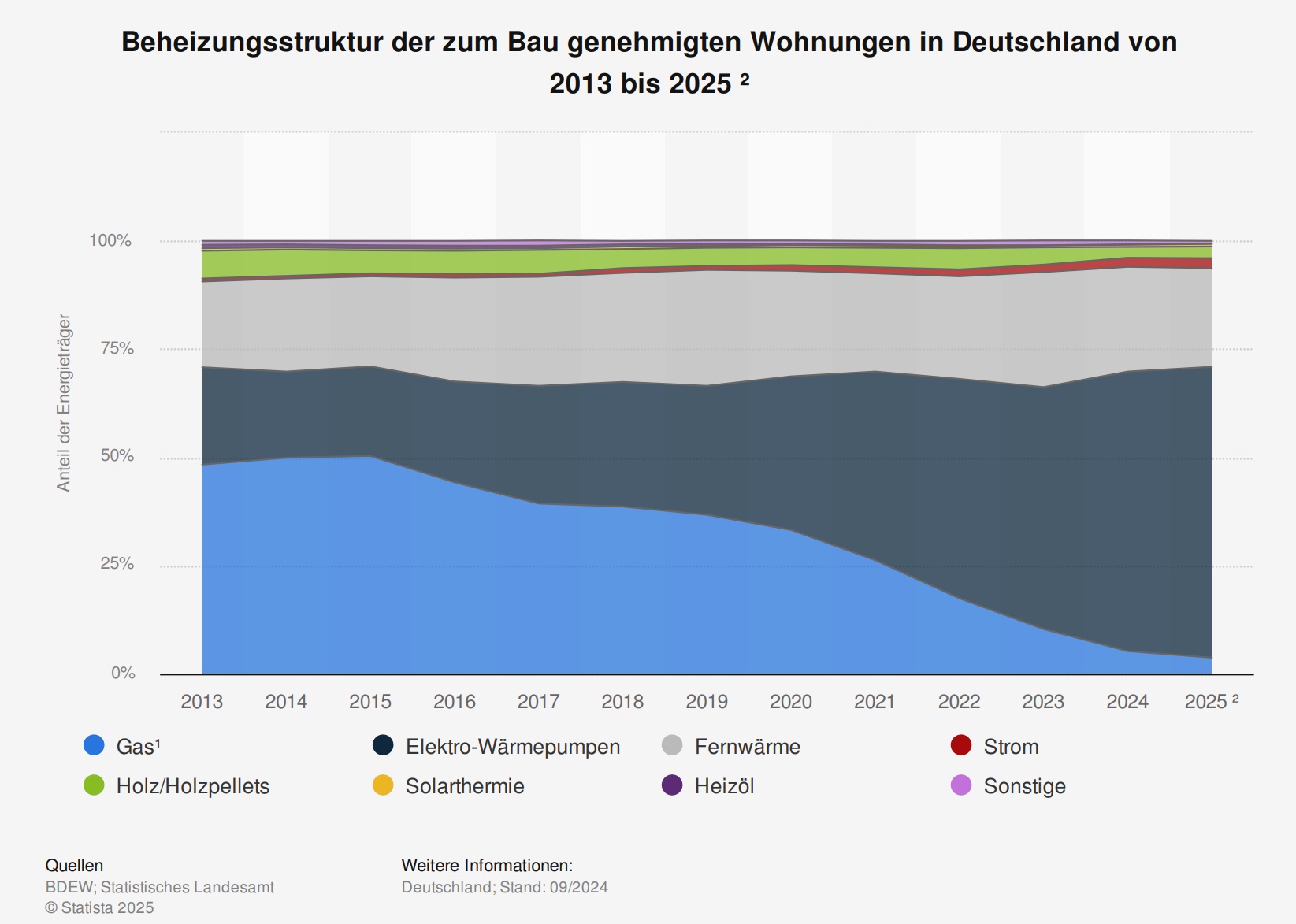 Over the past ten years, there has been a steady increase in building permits for new residential construction in Germany for electric heat pumps - in the year 2025 up to September, the share of this primary heating energy was 67.2 percent. However, the use of gas and bio natural gas has declined. While gas was the primary energy source for heating in around 48.3% of homes approved for construction in 2013, this figure was just 3.7% in the first nine months of 2025.