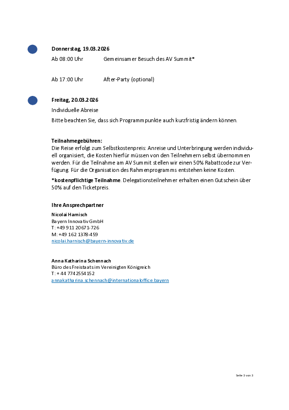Die Reise erfolgt zum Selbstkostenpreis: Anreise und Unterbringung werden individuell organisiert, die Kosten hierfür müssen von den Teilnehmern selbst übernommen werden. Für die Teilnahme am AV Summit stellen wir einen 50% Rabbatcode zur Verfügung. Für die Organisation des Rahmenprogramms entstehen keine Kosten.