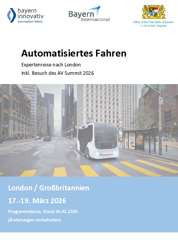 Gemeinsam mit dem Büro des Freistaats in London planen wir eine Expertenreise zum Thema „Autonomes Fahren“ nach London, einschließlich des gemeinsamen Besuchs des AV Summits. Die Reise umfasst ein Networking-Event mit britischen Stakeholdern, z.B. CCAV, Transport for London, Zensic sowie Besuchstermine bei einschlägigen Unternehmen (z.B. Oxa).