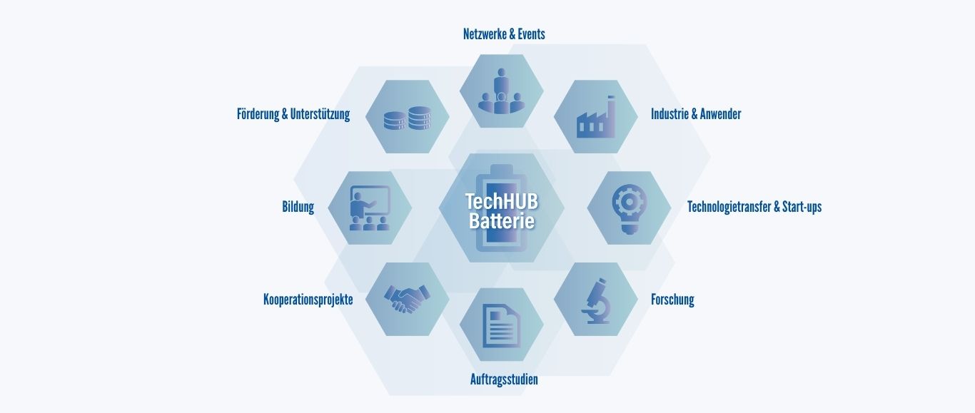 Der TechHUB Batterie koordiniert die Aktivitäten und Akteure im Batterieökosystem. Als neutrale Plattform des Freistaates Bayern ist der TechHUB zentraler Ansprechpartner für Vernetzung und Kooperationsanbahnung im breiten Themenfeld Batterie. Wir sammeln und bündeln das Wissen über Förder- und Unterstützungsangebote in Bayern und darüber hinaus